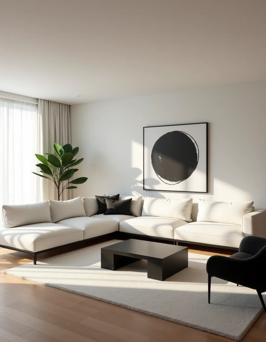 The living room exudes a serene minimalist atmosphere, showcasing an exquisite balance of negative space and streamlined design. A large, plush white sectional sofa with clean lines is centered in the room, paired with a low, geometric coffee table in matte black glass that complements the monochrome palette. Two sleek black armchairs frame the opposite side, their curvilinear form adding softness to the overall look. Minimalist art pieces, including a large black-and-white abstract canvas, adorn the walls, while a single potted rubber plant adds a touch of organic elegance, strategically placed in the corner to enhance the feeling of spaciousness. Warm natural light floods the space through sheer white curtains, casting gentle shadows and creating a welcoming ambiance that feels both modern and inviting.