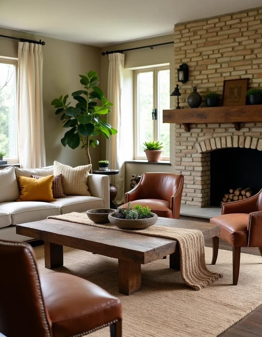 The living room exudes a rustic charm, featuring a large, reclaimed wood coffee table at the center, adorned with a woven wool table runner in earthy, natural tones of beige and ochre. Surrounding the table, a pair of distressed leather armchairs with rounded backs face a cozy, oversized beige sofa dressed in a soft, chunky knit wool throw. A rugged stone fireplace acts as a focal point on one wall, decorated with vintage metal sconces and an antique hand-carved wooden mantel showcasing various potted succulents. Natural light streams through sheer window curtains that frame the windows, casting gentle shadows on a plush, handwoven wool area rug that anchors the space and ties together the rustic color palette of browns, creams, and greens.