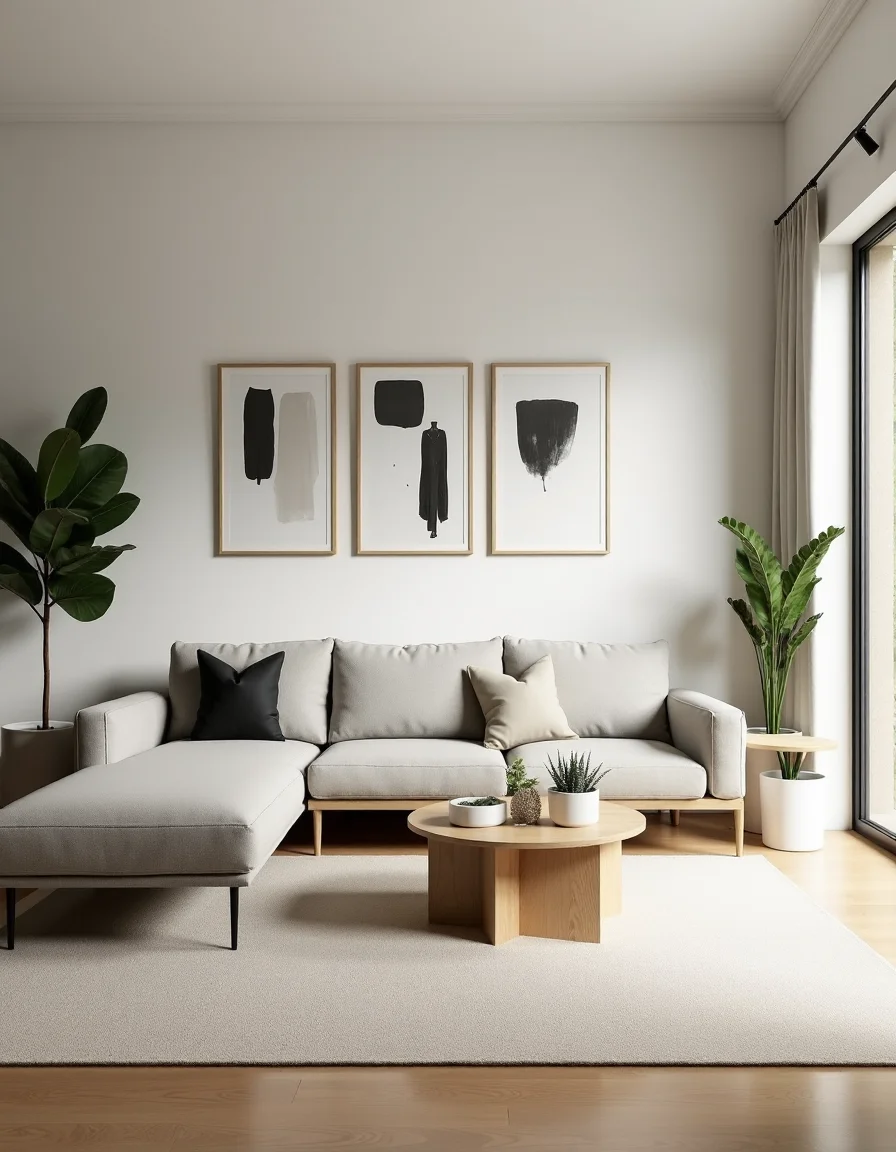 The living room embodies a minimalist design, featuring a spacious layout that invites natural light through large, unobstructed windows. A sleek, low-profile sectional sofa in a soft dove gray is centered against the wall, paired with a light oak coffee table that has a simple geometric form. Flanking the sofa are two compact, multifunctional side tables with built-in storage solutions, designed in a warm white finish that complements the neutral color palette. To enhance the aesthetic, a plush area rug in a muted ivory anchors the space, while a trio of black-and-white abstract art pieces adorns the wall, providing a modern yet subtle focal point. Indoor plants in minimalist planters add a touch of life and freshness to the room, making it both inviting and serene.