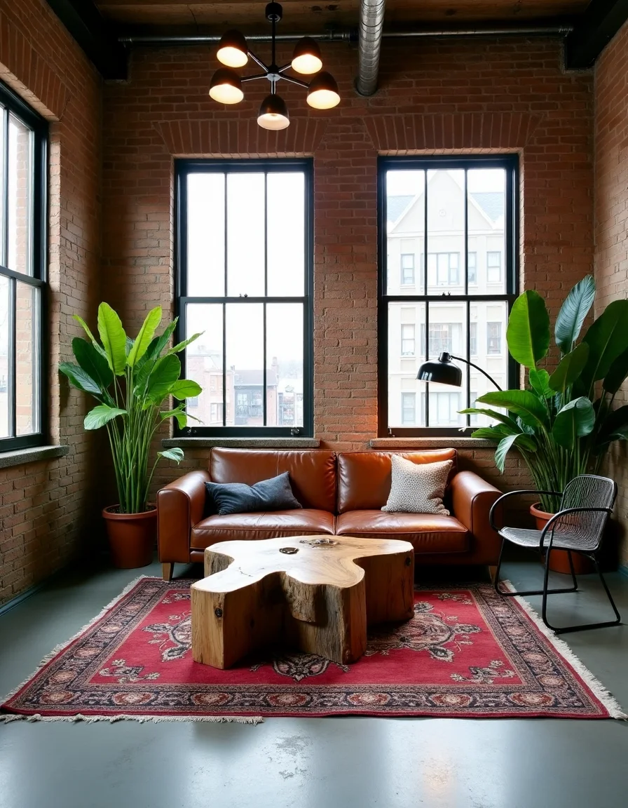 The living room embraces an industrial style characterized by an abundance of raw materials and textures. A striking exposed brick wall forms a backdrop, highlighting the room's rustic charm, while a pair of large ceiling windows floods the area with natural light, accentuating the warm tones of reclaimed wood furniture. In the center, a rugged, unpolished coffee table made from thick slabs of live edge wood sits atop a vintage Persian rug, offering warmth and contrast against the concrete flooring. A leather loveseat in deep chestnut brown is paired with a distressed metal side chair, and various oversized houseplants bring life to the corners, creating an inviting yet edgy atmosphere. Industrial-inspired pendant lights hang above, casting a warm glow over this eclectic but harmonious space.