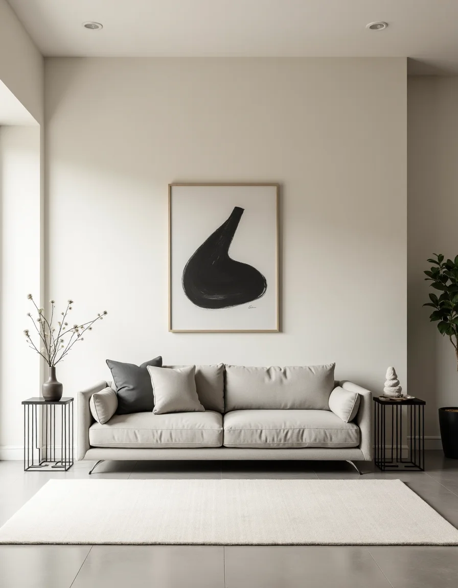 The minimalist living room features a clean, open layout that emphasizes simplicity and the beauty of negative space. A sleek, low-profile sofa in soft gray is centered against a light cream wall, adorned with a single abstract black and white artwork for contrast. Below the sofa, a simple white area rug creates an inviting foundation while also enhancing the room’s depth. On either side of the sofa, minimalist side tables with thin, geometric metal frames hold delicate, monochromatic decorative objects, such as a single stem vase and an artful stone sculpture, invoking a sense of understated elegance. Large windows allow natural light to flood the room, accentuating the harmonious blend of textures in the furniture and decorations, resulting in an airy, tranquil sanctuary.