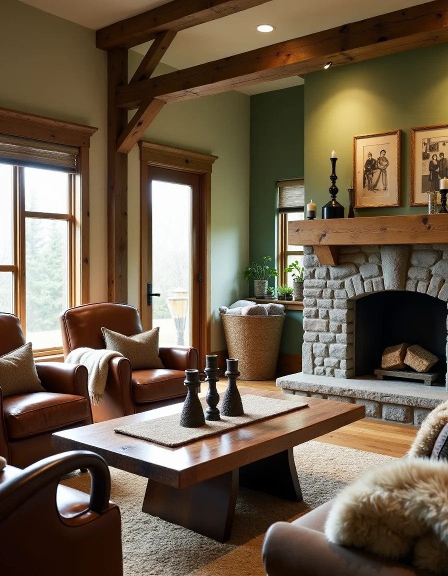 The living room embodies a rustic charm, featuring a large reclaimed wood coffee table at the center, adorned with a textured woolen runner and a few thick candles arranged in wrought iron candle holders. Surrounding the table are a pair of inviting leather armchairs with rich, warm tones, draped with soft fur throws for added coziness. The walls are painted in a soft, muted sage green, accented by exposed wooden beams that highlight the room's rugged elegance. A stone fireplace adds warmth and character, topped with a weathered mantle decorated with vintage photos in distressed frames and a few potted succulents. An inviting area rug with earthy tones anchors the seating area, while a woven wicker basket in one corner holds extra blankets, enhancing the snug ambiance.