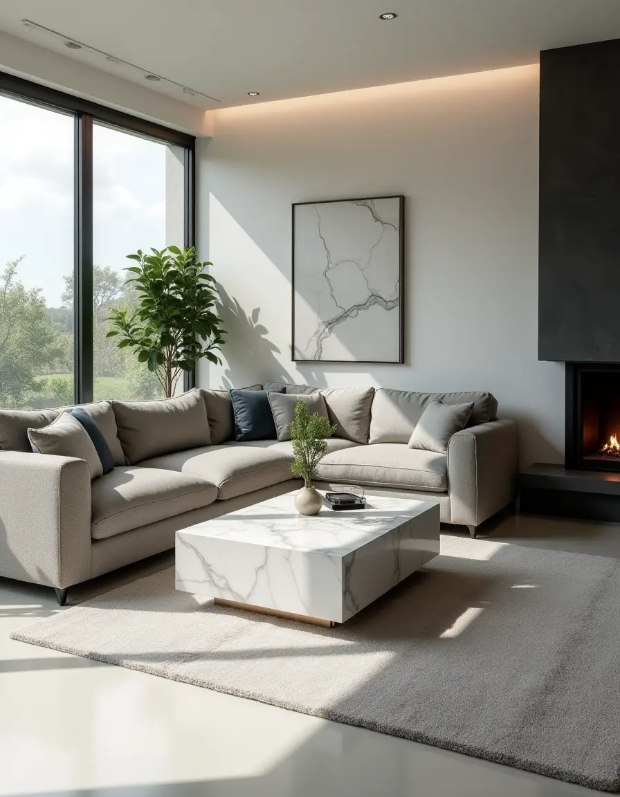 The living room exudes modern elegance with its minimalist design, featuring a smooth concrete floor that anchors the space. A large marble coffee table sits centrally in the room, its polished white surface reflecting the soft natural light filtering in through expansive floor-to-ceiling windows. Flanking the coffee table, a pair of low-profile grey sofas upholstered in textured fabric offer comfort and sophistication, accentuated by a few geometric throw pillows in muted tones. On one side, a sleek black stone fireplace serves as a dramatic focal point, while a few curated art pieces in simple frames adorn the walls, enhancing the overall clean aesthetic without overwhelming the senses. Potted greenery interspersed throughout adds a touch of warmth and life, contrasting beautifully with the cool color palette.