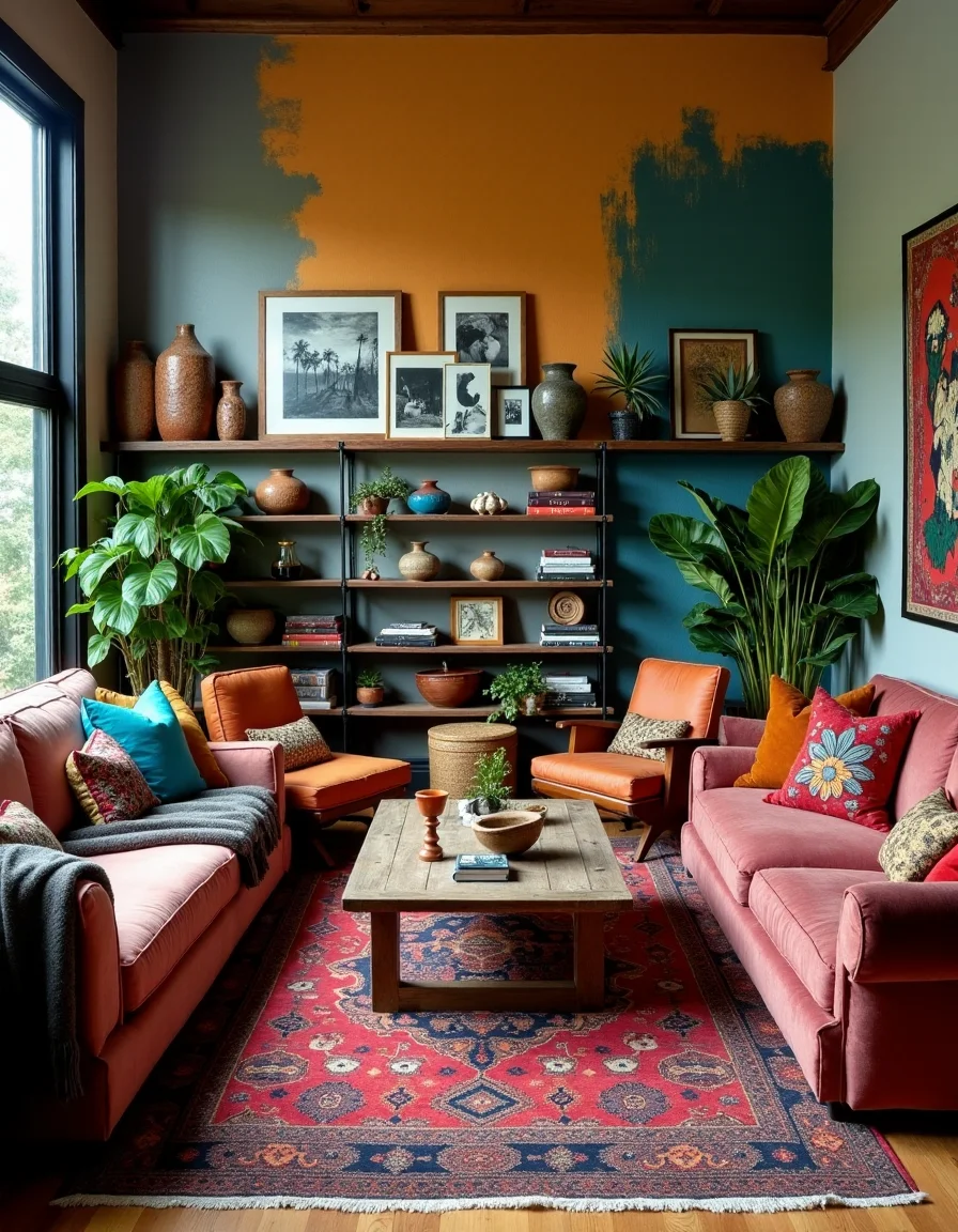 This bohemian living room radiates warmth and creativity, boasting a stunning mosaic of colors and patterns. A large, plush, vintage Persian rug in shades of deep red, navy, and gold anchors the space, surrounded by mismatched, overstuffed sofas and armchairs in rich jewel tones, each adorned with an assortment of handcrafted throw pillows. A reclaimed wood coffee table, artfully distressed, sits at the center, complemented by various potted plants that add a lush, green vibrancy to the area. In one corner, a tall shelf displays an eclectic collection of books, handmade pottery, and woven baskets, while a gallery wall brimming with abstract art and framed black-and-white photos sets a dynamic backdrop, characterized by splashes of warm ochre and teal.