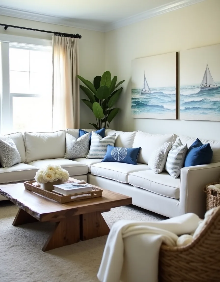 This seaside-inspired living room radiates a tranquil beach atmosphere, enveloped in soft blues and whites. The focal point of the room is a large, comfortable white sectional sofa adorned with a mix of coral and ocean-themed throw pillows, inviting relaxation. Natural light floods the space through sheer light linen curtains that lightly sway with the ocean breeze, enhancing the airy feel. A rustic coffee table made of reclaimed driftwood sits at the center, layered with a delicate seashell centerpiece and a few artful beach-themed books. An assortment of potted sea grasses and an oversized rattan basket filled with cozy cotton throws decorate the edges, while nautical wall art, featuring abstract waves and sailboats, adds a charming finishing touch to the beach-inspired decor.