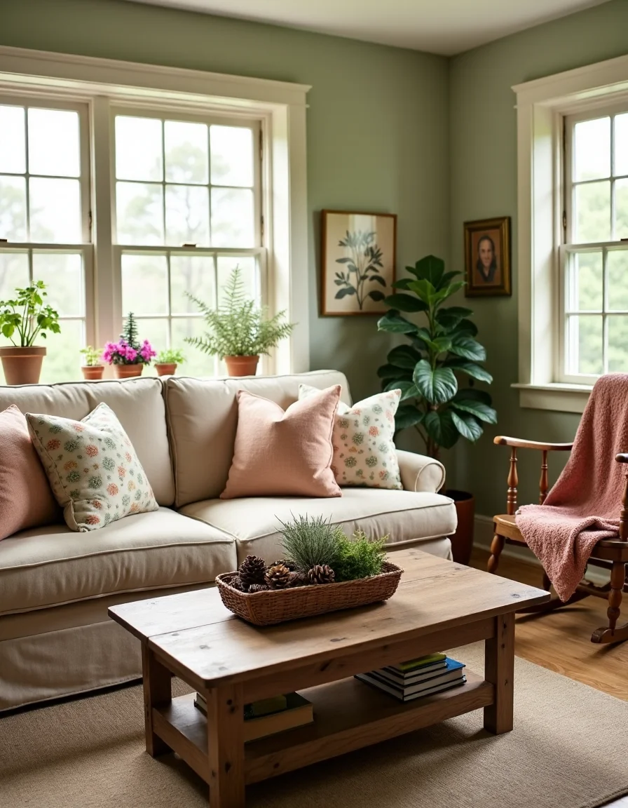 The living room embodies a cozy country aesthetic, with muted pastel tones of soft sage green and gentle peach adorning the walls, creating a warm and inviting atmosphere. A large, overstuffed beige slipcovered sofa anchors the space, adorned with a trio of mismatched throw pillows in floral patterns that echo the color palette. In front of the sofa, a rustic reclaimed wood coffee table features a distressed finish, topped with a woven basket holding assorted natural elements like pinecones and dried lavender. To the side, an antique wooden rocking chair offers a nod to traditional craftsmanship, while a hand-crocheted afghan draped over its arm invites one to sit and relax. Various potted plants, ranging from ferns to small herbs, fill the windowsill, enhancing the homely vibe with touches of greenery.