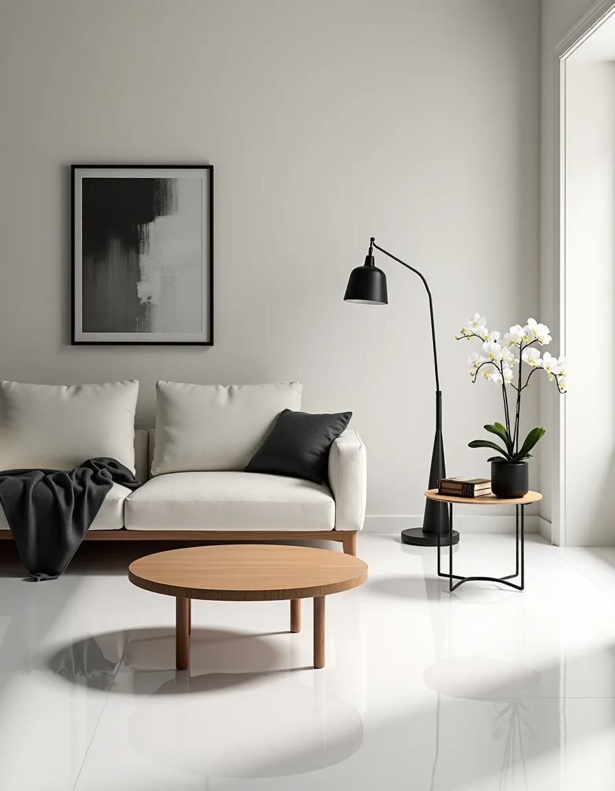 The living room embodies a serene minimalist aesthetic, featuring an expansive area anchored by a low-profile, off-white sofa adorned with a single slate gray throw blanket meticulously draped across one arm. Opposite the sofa is a warped-edge beech wood coffee table, its warmth contrasting beautifully with the white Terrazzo flooring, which leads into an elegantly spaced layout that emphasizes negative space. Flanking the sofa, two slender black metal side tables hold monochrome vases with delicate white orchids, adding a touch of nature while maintaining the simplistic palette. A large abstract black-and-white painting hangs dramatically on the wall, inviting contemplation while reinforcing the overall calmness of the environment. The room is softly illuminated by a minimalist hairpin-style floor lamp in matte black, casting gentle shadows that dance along the clean lines of the space.
