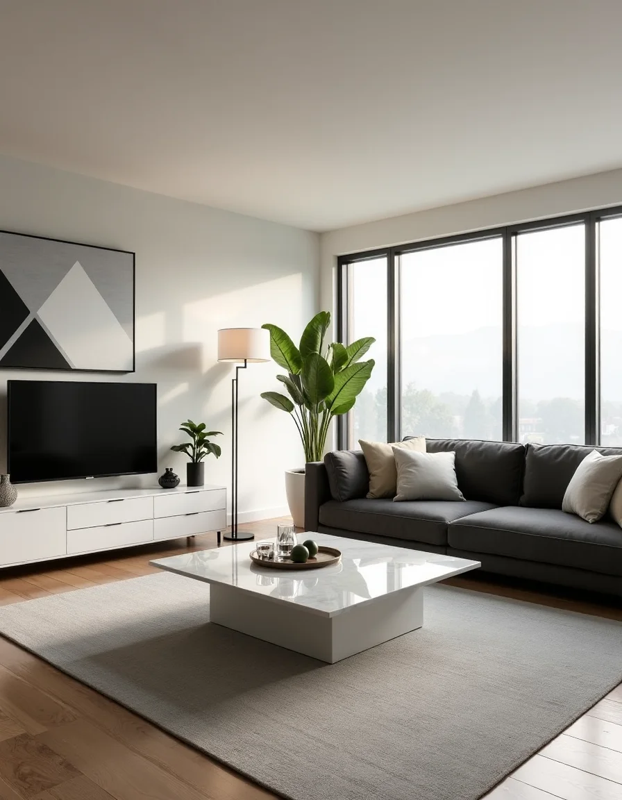 The living room exudes a modern elegance anchored by a sleek, charcoal gray sectional sofa positioned in the center, adorned with minimalist, beige pillows. A glossy white marble coffee table with clean lines rests on a plush, light gray area rug, reflecting soft natural light streaming through oversized floor-to-ceiling windows. On one side, a contemporary white media unit blends seamlessly with the geometric wall art that adds a splash of monochrome sophistication above it. Potted green plants in minimalist pots are strategically placed in the corners, contrasting beautifully with the simple color palette, while a stylish floor lamp with a slim profile illuminates the space, enhancing its airy and uncluttered atmosphere.