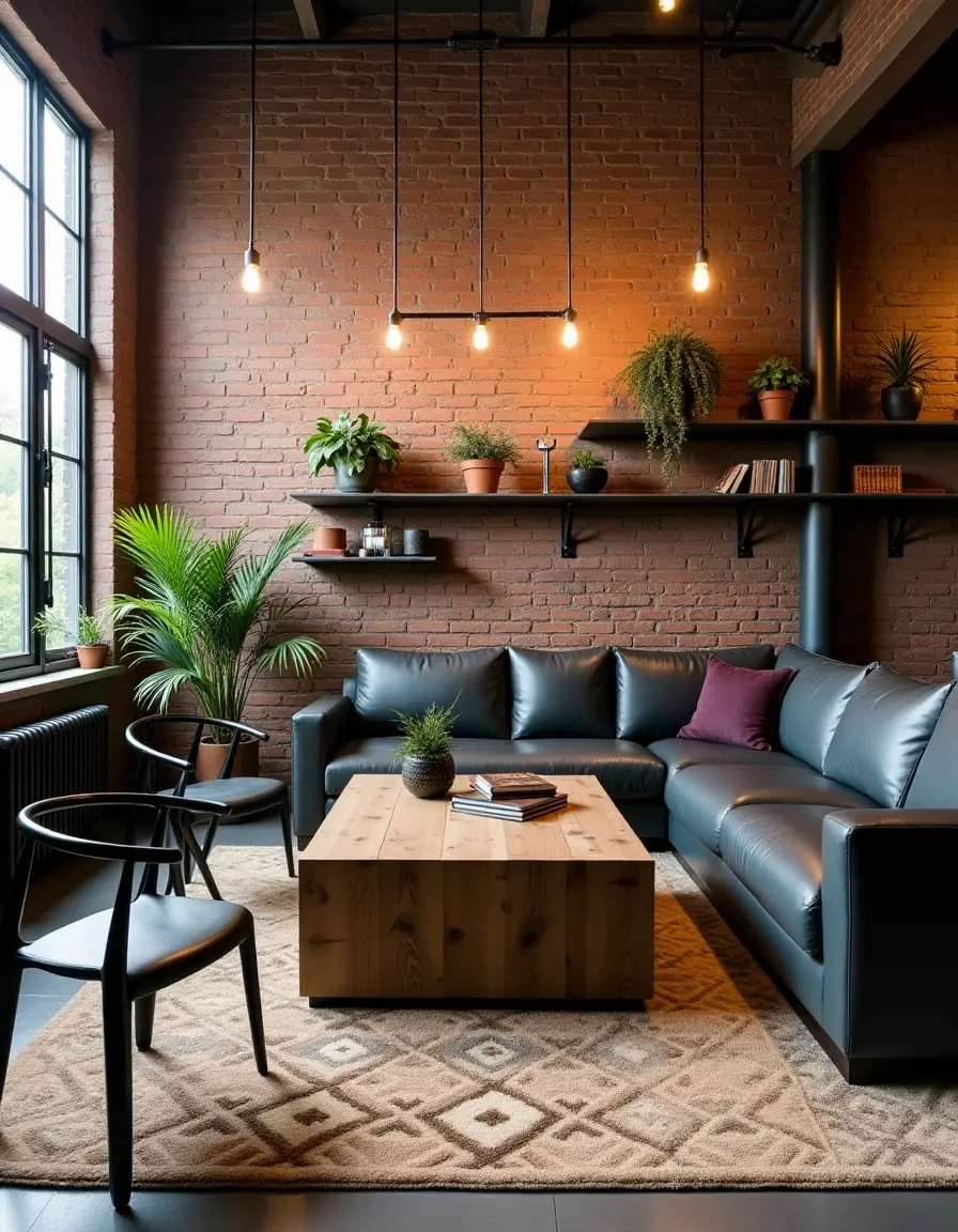 The living room exudes an industrial charm, characterized by exposed burnt brick walls that create a warm yet raw ambiance. A large, solid wooden coffee table with a distressed finish occupies the center, surrounded by mismatched metal chairs featuring a blend of matte black and galvanized steel. Above, the ceiling boasts expansive floor-to-ceiling windows, allowing natural light to stream in and illuminate the room, complemented by striking pendant lights made of recycled steel with Edison bulbs for a vintage touch. To one side, an oversized leather sectional in a deep charcoal color contrasts beautifully with the brushed metal shelves displaying eclectic decor items and greenery in terracotta pots, injecting life into the industrial aesthetic. A plush area rug with geometric patterns in muted earth tones ties the space together, grounding the room’s rugged elements and providing comfort underfoot.