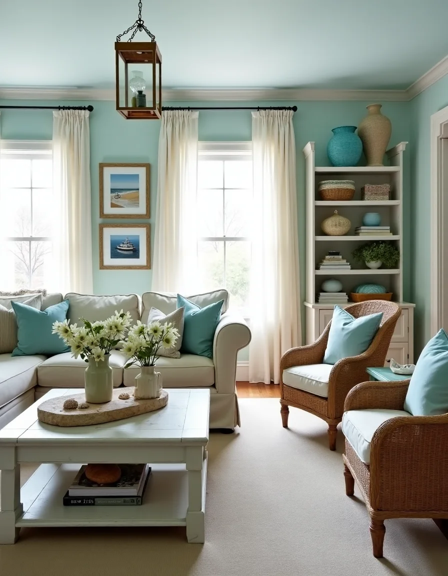 The living room embodies a serene seaside vibe, featuring soft blue walls that evoke the calmness of the ocean. A large, plush, light beige sofa is centered against the wall, adorned with an array of throw pillows in various shades of sandy beige and oceanic teal. Atop a subtle striped carpet that mimics beachy waves, a weathered white coffee table holds a collection of seashells and a driftwood vase filled with fresh white daisies. To the right, a pair of woven rattan armchairs flanks a tall bookshelf brimming with nautical-themed decor, including framed coastal photographs and maritime books. Ambient light spills through sheer, billowy curtains, amplifying the airy atmosphere as a coastal lantern hangs gently from the ceiling, completing the tranquil seaside retreat.