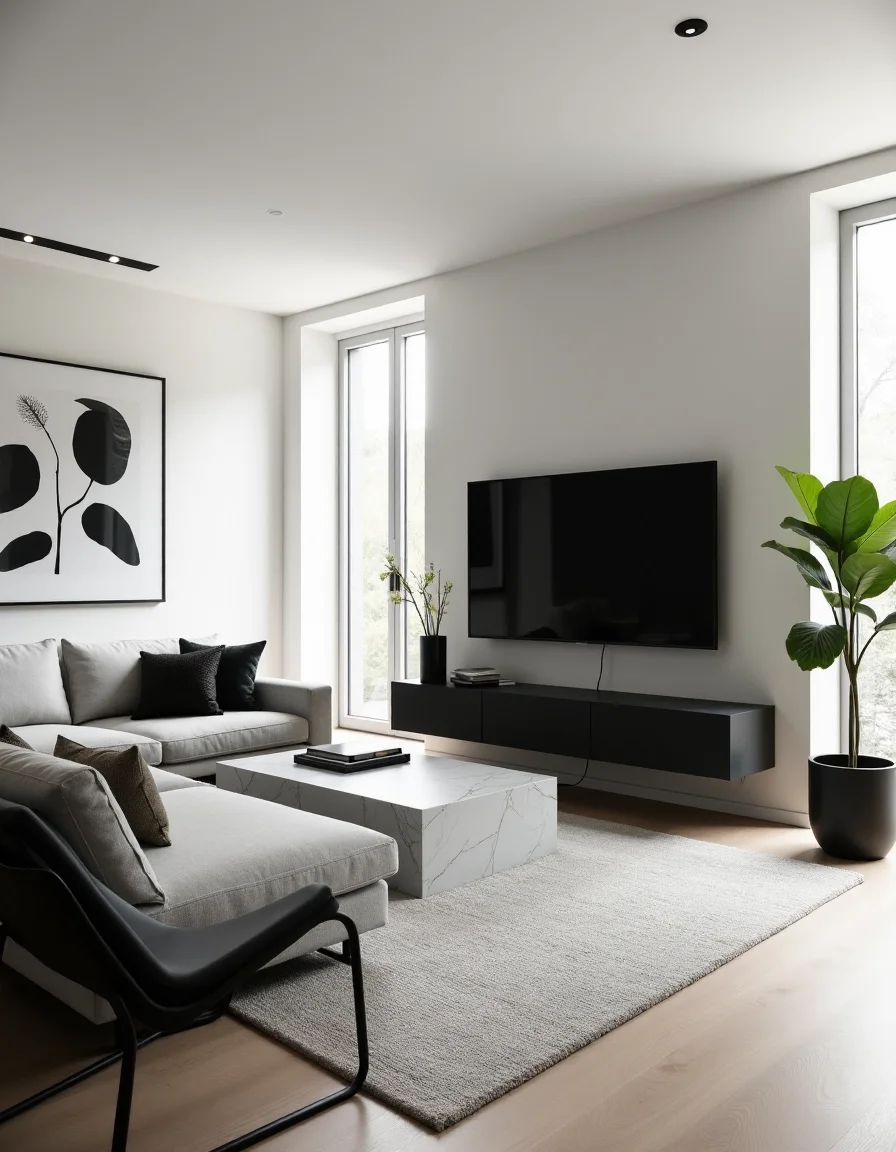 The living room is a spacious, minimalist design featuring a monochrome palette predominantly in shades of white, gray, and black. A sleek, low-slung sectional sofa, upholstered in soft, light gray fabric, is positioned in the center of the room, facing a floating, wall-mounted entertainment unit made of matte black finish with a hidden cable management system. Complementing the sofa, a rectangular, white marble coffee table with clean lines sits above a low-pile gray area rug, anchored by two minimalist black accent chairs with sharp angles at each end. On the walls, subtle artwork featuring abstract black and white shapes adds a touch of sophistication without overwhelming the space, while large floor-to-ceiling windows allow natural light to spill in and illuminate the room, enhancing the overall airy feel. Simple, indoor greenery in a single black ceramic pot stands in one corner, introduced for contrast and to breathe life into the uncluttered environment.
