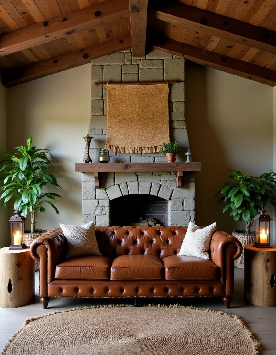 This rustic living room exudes warmth and charm with its exposed wooden beams and stone fireplace, adorned with a handmade woven tapestry above it. A large, tufted leather sofa in deep brown sits in front of the fire, complemented by a couple of reclaimed wood side tables flanking it, each adorned with vintage lanterns that glow softly in the evening light. A braided jute rug lies underfoot, providing texture and a touch of coziness, while an assortment of textured throw pillows in earthy tones adds comfort. The walls are painted in a soft taupe, contrasting beautifully with the natural tones of potted green plants placed in the corners, creating a harmonious blend of style and natural elements.