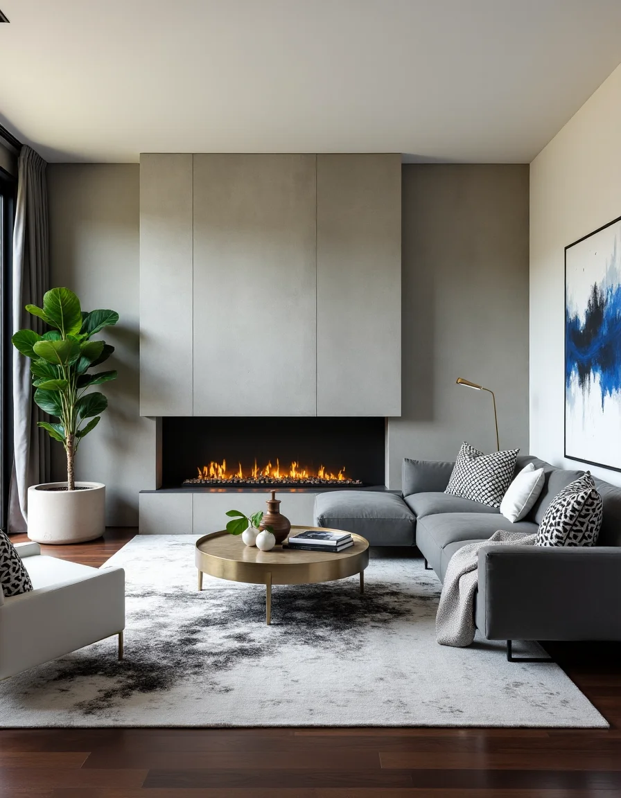 The living room boasts a sleek modern aesthetic with a stunning contrast of concrete and marble elements. A large concrete wall serves as a dramatic backdrop, accentuated by a minimalist marble fireplace that invites warmth into the space. Centered on a dark hardwood floor is a spacious, low-profile grey sectional sofa adorned with geometric-patterned throw pillows in black and white. Flanking the sofa are two elegant white marble side tables featuring brushed gold metallic accents, while a large abstract painting with splashes of cobalt blue provides a pop of color above the mantel. An oversized black and white area rug softens the harshness of the concrete, and lush greenery from a tall potted fiddle leaf fig tree adds life to the sharp lines of the room.