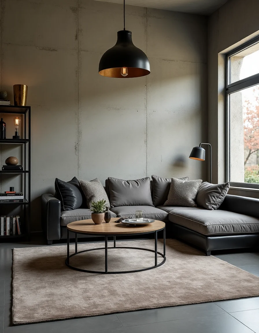 The living room embodies an industrial aesthetic, with an exposed concrete wall serving as a striking backdrop. A large gray sectional sofa with black leather accents anchors the space, adorned with textured pillows in deep charcoal and tarnished silver. A reclaimed wood coffee table, with metal legs showcasing a distressed finish, sits at the center, flanked by oversized black floor lamps with Edison bulbs that cast a warm glow. Industrial-style metal shelving units, filled with books and artful sculptures, line the opposite wall, while a plush area rug in muted tones of gray and beige softens the starkness of the concrete flooring. A hanging metal pendant light with a matte black finish adds an element of modern elegance overhead, bringing the overall design together in a harmonious blend of rugged and refined.