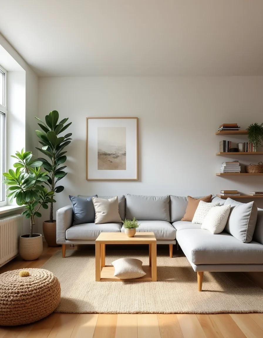 The living room is a bright and airy space that embodies Scandinavian design principles through its minimalist aesthetic and functional décor. A large, light wood coffee table sits in the center, surrounded by a pair of soft, muted gray sectional sofas adorned with fluffy white throw pillows. To introduce warmth, a creamy jute area rug covers the hardwood floor, complemented by an earth-toned crochet pouf in a warm beige beside it. Lush potted plants of various sizes add a touch of greenery, strategically placed near a large window that welcomes natural light, while minimalist wall art showcasing abstract patterns leans against the whitened walls, providing an artistic yet unobtrusive focal point. Shelves made of light oak hold neatly stacked books and curated knick-knacks, all contributing to an inviting and harmonious living space.