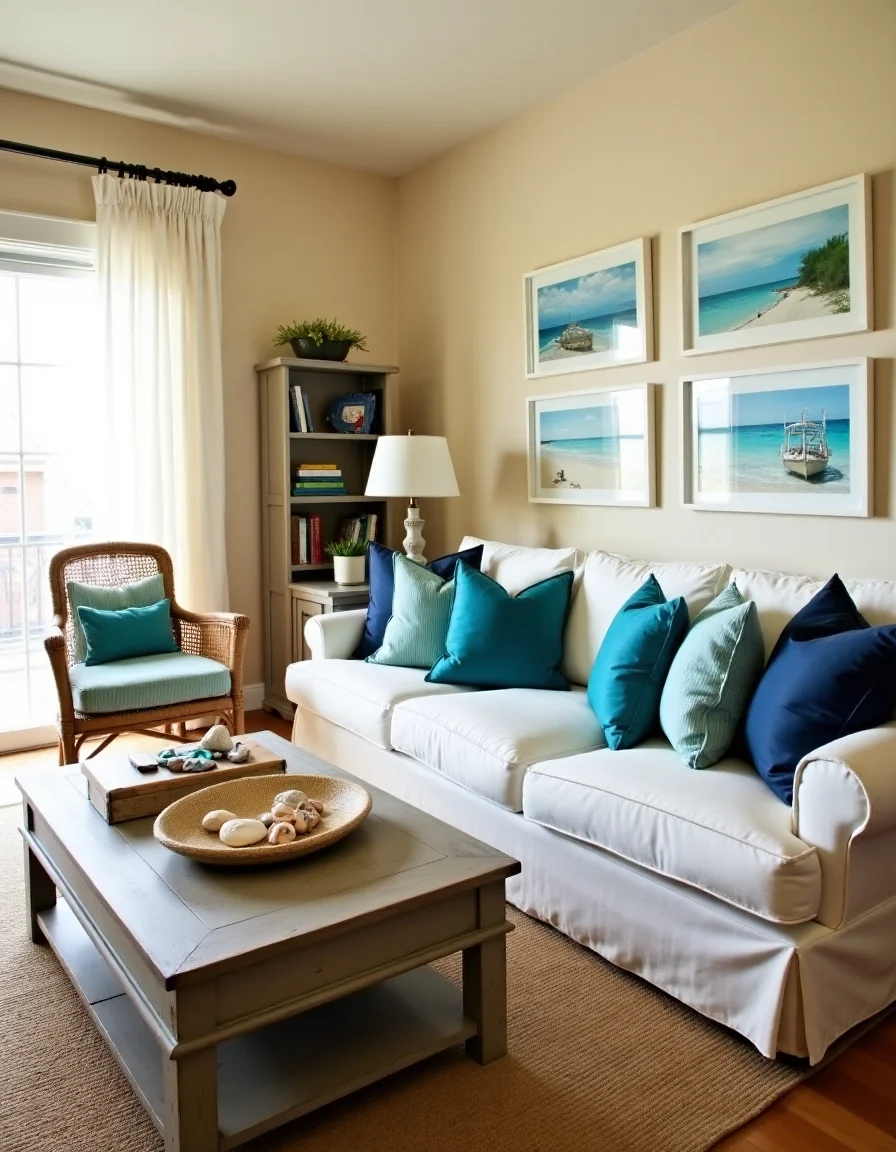 The living room exudes a breezy seaside charm, with walls painted a soft, sandy beige that evoke the warmth of sun-drenched beaches. A plush, white sectional couch sits center stage, adorned with an array of turquoise and navy-blue throw pillows that mimic the colors of ocean waves. To the left, a reclaimed wood coffee table features a distressed finish, topped with a decorative bowl of seashells and a small potted succulent for a touch of green. Light sheer curtains flutter gently by the open windows, allowing warm sunlight to filter in, while a vintage rattan armchair, set beside a compact bookshelf filled with nautical-themed books, invites relaxation and casual reading. The room is completed with a woven jute area rug that adds texture and a coastal feel underfoot, alongside framed prints of ocean scenes hanging casually above the couch.