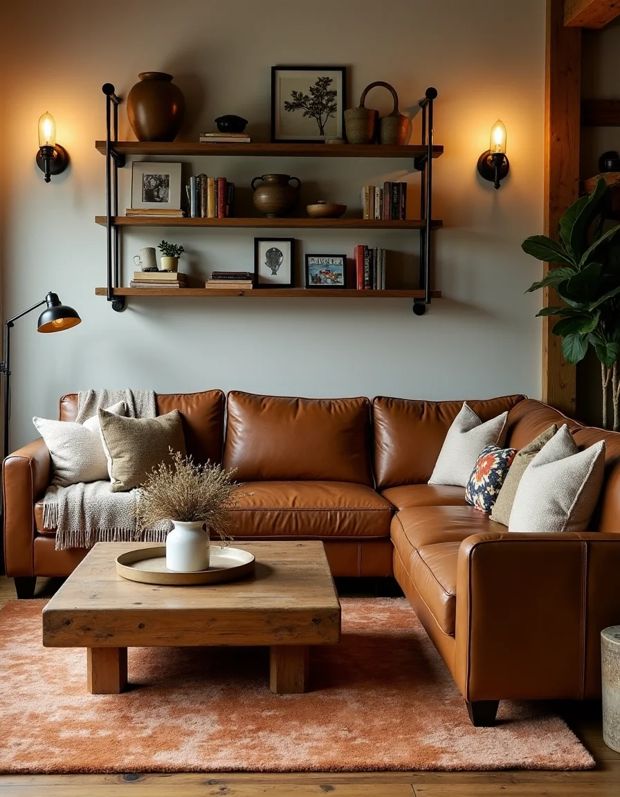 This rustic living room envelops you in cozy warmth, accented with soft earth tones like deep browns, warm terracotta, and muted greens. A large brown leather sectional sofa is positioned in an inviting L-shape around a reclaimed wood coffee table, adorned with a small white vase filled with dried wildflowers. Above the sofa, industrial-style shelves showcase an array of vintage books, locally crafted pottery, and framed black-and-white photographs, contributing to a sense of history and comfort. The room is bathed in a soft glow from wrought iron sconces on the walls, while a textured woolen throw blanket and plush, patterned cushions make the space feel homey. An oversized area rug with warm ochre and burnt sienna tones lies beneath the coffee table, providing a grounding element for the warm wooden floor and tying the whole room together.