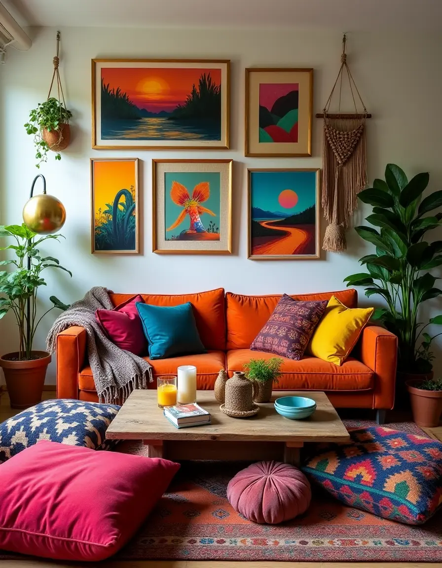 This vibrant bohemian living room bursts with color and creativity, featuring a mix of patterns and textures that invite warmth and relaxation. Plush, oversized floor cushions in rich jewel tones are scattered around a rustic wooden coffee table, while an eclectic assortment of throw blankets drapes over the sides, each with unique ethnic patterns. Walls are adorned with a gallery of framed paintings, showcasing bold abstract art and vibrant landscapes, intermixed with woven wall hangings and a macramé plant holder that elegantly displays cascading greenery. The room is illuminated by a soft glow from a vintage brass floor lamp, while potted plants in varied shapes and sizes punctuate the space, bringing a touch of nature indoors and completing the bohemian ambiance.
