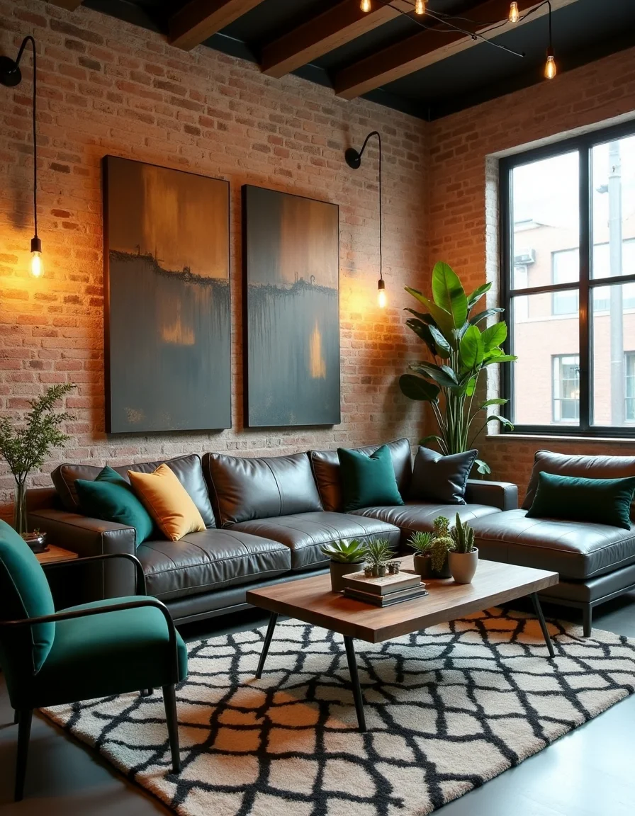 The living room embraces an industrial style with a wow factor, characterized by a large, distressed gray leather sectional sofa positioned centrally against the wall, showcasing a unique patchwork texture. A pair of black wrought-iron accent chairs with deep green upholstery flank a reclaimed wood coffee table, which has iron legs and a weathered finish, set slightly askew for a relaxed vibe. Overhead, exposed Edison bulb pendant lights dangle from dark metal chains, casting a warm glow over the space. The walls are dressed in raw, unfinished brick paired with large-scale abstract art that incorporates earth tones and metallic touches, while a plush geometric rug in black and cream grounds the entire setup without detracting from the industrial flair. Completing the look, several potted succulents in varied sizes sit atop shadowy steel side tables, adding a refreshing pop of greenery amidst the raw materials.