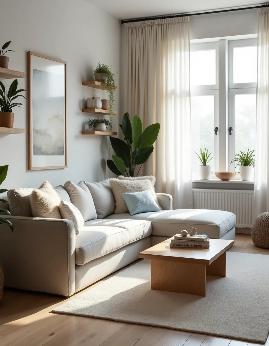 The living room features a harmonious blend of Scandinavian design principles, showcasing pale tones of whites, grays, and soft blues throughout the space. A plush, light gray sectional sofa sits against one wall, adorned with fluffy cream and muted pastel throw pillows, creating an inviting focal point. Across from it, a sleek, light oak coffee table with rounded edges rests atop a soft, textured area rug in off-white that buffers the floor's cool wooden planks. Surrounding the room are minimalist shelves filled with indoor plants in ceramic pots, artisanal home decor pieces, and a softly glowing abstract wall art that enhances the tranquility of the atmosphere. The finishing touch is a pair of large windows draped in sheer, white linen curtains that gently diffuse natural light, making the space feel airy and welcoming.