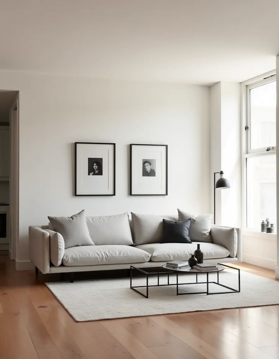The living room embodies a refined minimalist aesthetic with its open and airy layout. The walls are painted in a soft, warm white, enhancing the feeling of space, while a sleek, low-profile light gray sofa is centered against the back wall, adorned with a few monochrome cushions. A delicate glass coffee table with clean lines sits at the center, reflecting the soft natural light from the large, unobtrusive window to the right. Smooth hardwood floors in a muted oak tone create a warm contrast, while a small, contemporary area rug in a subtle geometric pattern adds a touch of texture beneath the seating area. On the walls, minimalistic art pieces in black and white are framed, providing a sophisticated yet understated visual interest.