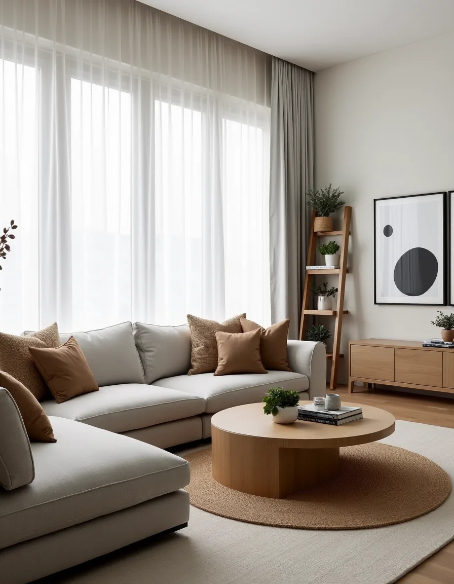 The living room embodies a modern aesthetic, grounded in a clean palette of soft whites and muted grays, accentuated by matte finishes. A large, L-shaped sectional sofa in a light gray fabric occupies the center of the space, adorned with minimalistic, textured throw pillows in subtle earth tones. A sleek, low-profile coffee table made of natural oak sits in front, while a plush area rug in warm beige grounds the area. Floor-to-ceiling windows dressed in sheer white curtains illuminate the room, showcasing a simple yet elegant decorative ladder shelf nearby that displays a curated selection of potted succulents and contemporary art books. Finally, an abstract black-and-white painting hangs on the wall, unifying the modern elements and adding an artistic touch to the overall ambiance.