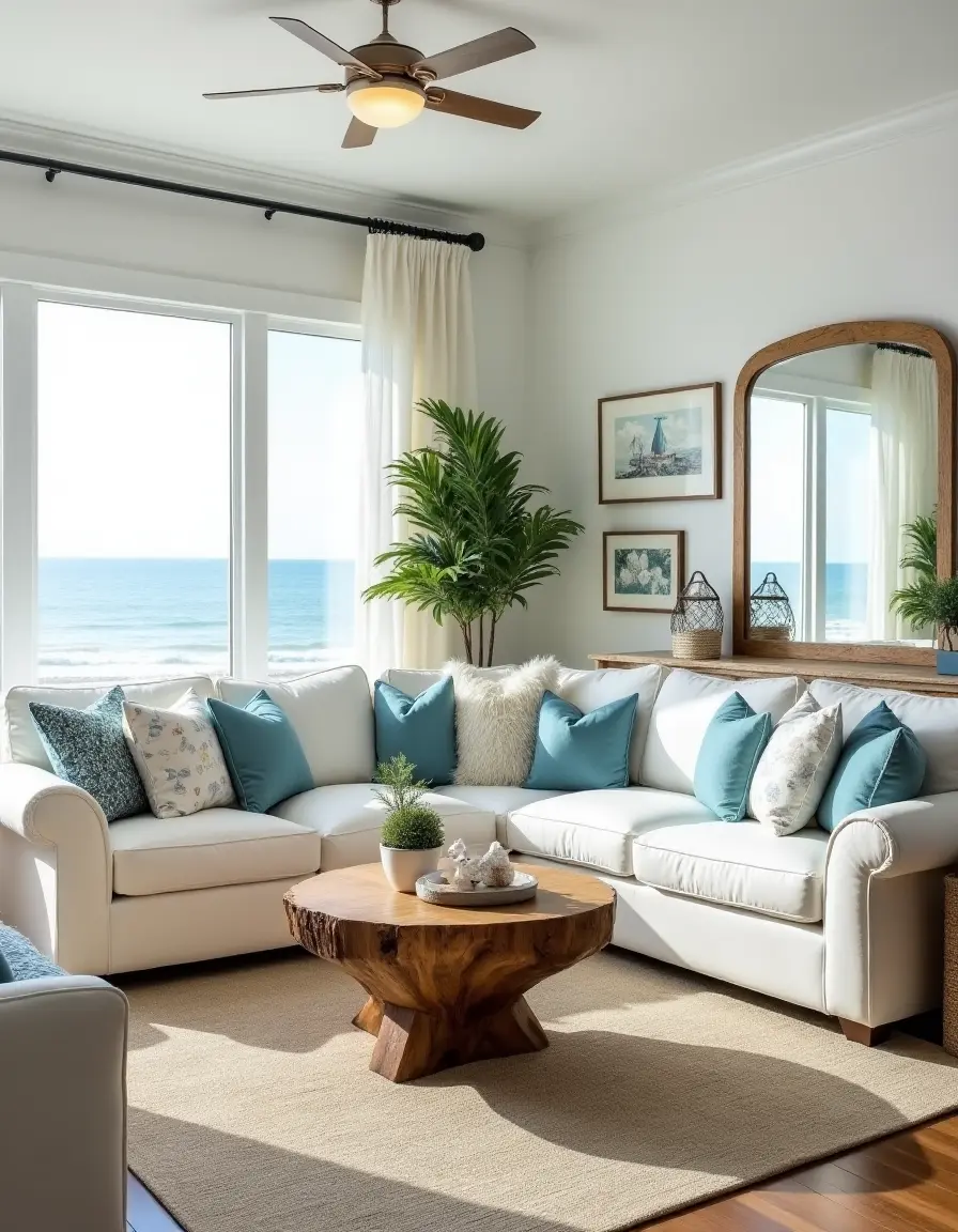 The living room embodies a serene seaside retreat, anchored by a plush white sectional sofa adorned with soft, fluffy throw pillows in varying shades of ocean blue. Light, sheer curtains dance gently in the salty breeze, framing large windows that offer a panoramic view of the coastline. A rustic driftwood coffee table sits at the center, its weathered texture complementing a cozy beige area rug adorned with nautical motifs. Along the walls, nautical-themed artwork in soft pastels and a few framed seashells create an inviting gallery, while decorative lanterns and woven baskets filled with beach towels infuse the space with charming coastal details. Potted palm trees and a large, airy mirror reflect the abundant natural light, enhancing the tranquil ambiance of this seaside haven.