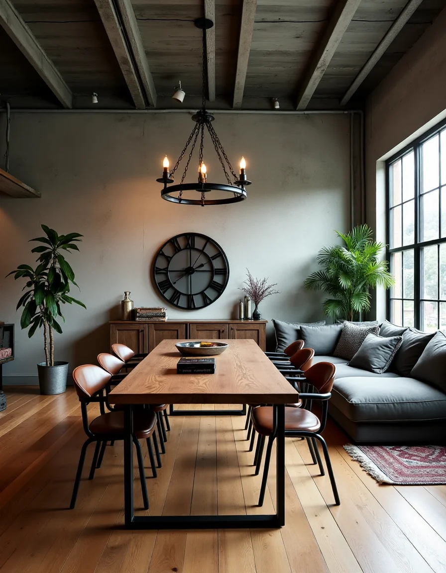 The living room embraces a striking industrial style, characterized by exposed steel beams and raw concrete walls that create an urban chic atmosphere. At the center, a robust solid wooden dining table in rich walnut stands proudly, surrounded by high-back metal chairs with distressed leather cushions, adding comfort and texture. A plush, oversized gray sectional sofa in a dark fabric offspring juts into the space, complemented by a reclaimed wood coffee table adorned with vintage industrial decor items, such as a large metallic clock and a set of antique books. For ambient lighting, an imposing black metal chandelier hangs from above, casting warm tones, while potted greenery in galvanized metal planters injects life into the room's rugged aesthetic. Large factory-style windows allow natural light to flood in and accentuate the contrasting soft textiles and the stark industrial elements, creating a perfect balance in this beautifully curated living space.