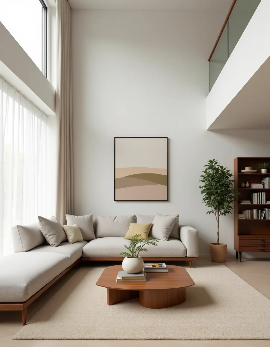 The living room embodies a serene minimalist style with an emphasis on multi-functionality and durability. A low-profile, light grey sectional sofa sits against a pale white wall, framed with a large piece of abstract art featuring soft, muted tones that create a calming focal point. Across from the sofa, a sleek walnut coffee table doubles as storage with its hidden compartments and minimalist style, while light earth-toned rugs add a touch of warmth beneath it. In one corner, a small green plant in a ceramic pot contrasts beautifully with the overall neutral palette, and a slim bookshelf, made of recycled wood, holds a selection of books and neatly organized decorative items, enhancing the streamlined visual flow. Large, unobtrusive floor-to-ceiling windows allow natural light to flood the space, complemented by sheer white curtains that harmonize with the room's airy ambiance.