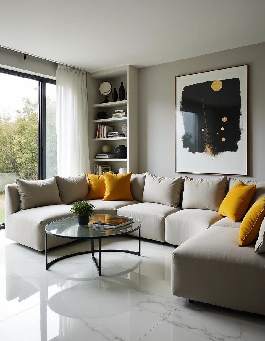 The living room exudes a chic modern ambiance, featuring a large glass coffee table at the center, reflecting the soft natural light pouring in through floor-to-ceiling windows. A plush, dove-gray sectional sofa gracefully curves around the space, adorned with vibrant mustard-yellow throw pillows that add a pop of color against the cool tones. The floor is finished in sleek white marble, which complements a minimalist white bookcase that houses a curated collection of art books and decorative vases. In one corner, a stylish glass side table holds a small, lush green plant, while an abstract black-and-white painting with gold accents hangs on the complementary light-gray wall, tying the room together with sophisticated elegance.