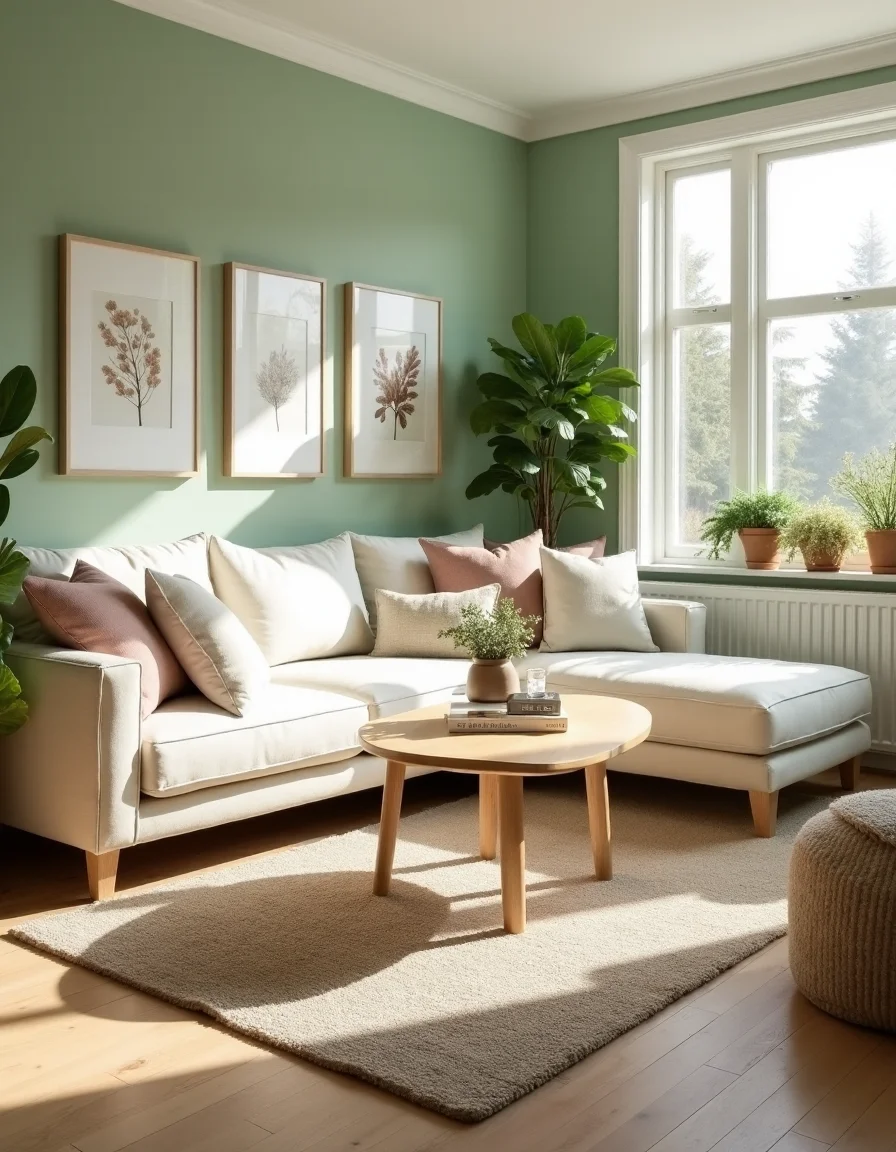 This Scandinavian-style living room exudes a bright and airy ambiance, characterized by soft colors and pale tones. The room features a large, cream-colored sectional sofa with minimalist lines, adorned with an array of textured throw pillows in muted pastels. A light maple wood coffee table with sleek, tapered legs sits at the center, surrounded by a soft, woven area rug in shades of beige. On the walls, a soft sage green adds a refreshing touch, complemented by framed botanical prints in natural wood frames. Large windows allow natural light to flood in, enhancing the space, while lush indoor plants such as a fiddle leaf fig and hanging pothos create a connection to nature, echoing the Scandinavian philosophy of harmonizing with the environment.
