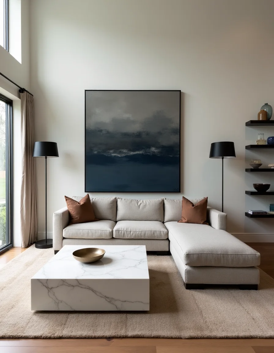 The living room features a sleek, modern design that exudes elegance with its minimalistic approach. A plush, light gray sectional sofa occupies the center, adorned with accent pillows in muted earth tones to add warmth. In front of the sofa, a rectangular white marble coffee table rests on a soft beige area rug, its clean lines reflecting contemporary styling. A large abstract artwork in shades of deep blue and charcoal graces the wall above the sofa, flanked by two stylish floor lamps with black metal bases, while minimalist floating shelves display curated decorative items in glass and ceramics. The overall ambiance is enhanced by large windows that invite natural light, accentuating the rich materials and spacious feel of the room.