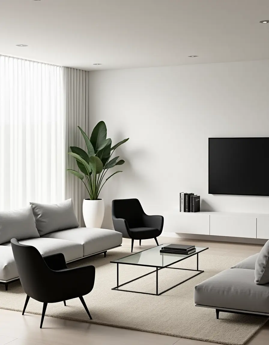 The living room embodies a minimalist aesthetic, characterized by a spacious layout that prioritizes functionality and clean lines. A plush, low-profile sectional sofa in soft gray fabric anchors the space, complemented by a pair of sleek, black accent chairs that maintain the monochrome palette. In front of the seating arrangement, a slender coffee table of clear glass with black metal legs creates an unobtrusive focal point, while a few carefully chosen art books, stacked vertically, lend a hint of personality. An ultra-thin media console in matte white is mounted against the far wall, housing a flat-screen television with minimal distractions, and a large potted snake plant in a simple white planter introduces a touch of greenery, enhancing the crisp, airy ambiance. The room is softened with a plush, light beige area rug that ties together the monochrome elements while adding warmth underfoot.