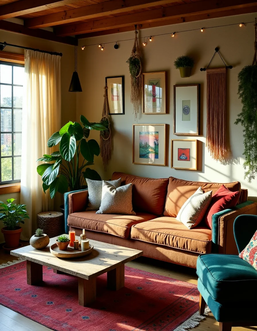 The living room is a vibrant haven of bohemian chic, where sunlight streams through sheer linen curtains, casting soft shadows on the rich, textured walls adorned with an eclectic array of framed artwork. A large, flowing, antique Turkish rug in deep reds and oranges anchors the space, layered under a low, reclaimed wood coffee table with a distressed finish, decorated with an assortment of candles and artisan succulents in handmade ceramic pots. Colorful throw pillows in an array of patterns, including geometric and floral motifs, invite relaxation on the oversized, plush sofa, which boasts a mix of jewel-toned fabrics like emerald green, cobalt blue, and a splash of mustard yellow. Potted plants in varying heights, like a tall fiddle leaf fig and cascading pothos, are strategically positioned to breathe life into the corners, while macrame hangers showcase air plants and trailing ivy from the ceiling beams, adding vertical interest. The walls are further embellished with an assortment of woven textiles and dreamcatchers, creating a cozy, bohemian ambiance enhanced by the soft, warm glow of string lights draped artistically around the room.