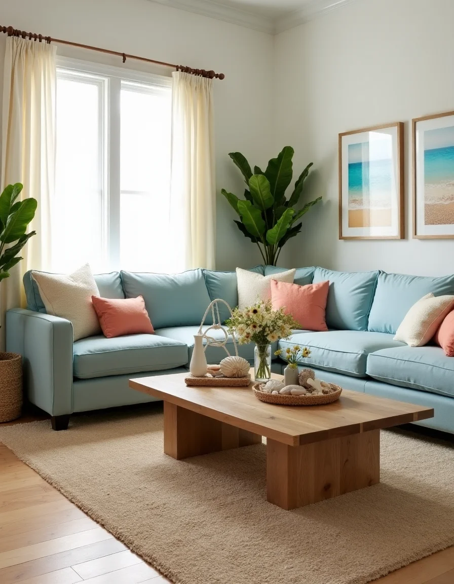 The seaside living room exudes a tranquil beach atmosphere, anchored by a soft, sandy beige area rug that sprawls across the light oak floor, reminiscent of the shore. A comfortable, oversized light blue sectional sofa is positioned in a U-shape, adorned with an assortment of cream and coral throw pillows, evoking the gentle hues of the ocean waves. Flanking the sofa are two tall indoor plants in woven baskets, enhancing the room's natural flow, while sheer, billowy white curtains hang gracefully from a driftwood rod, allowing sunlight to filter in softly, adding warmth to the space. A nautical-inspired coffee table made from reclaimed wood sits in the center, topped with seashells and a glass vase filled with fresh wildflowers, complemented by a whimsical lighthouse figurine on one side. Finally, the walls are adorned with framed coastal prints, featuring serene seascapes and sandy beaches, establishing a peaceful, coastal retreat atmosphere.