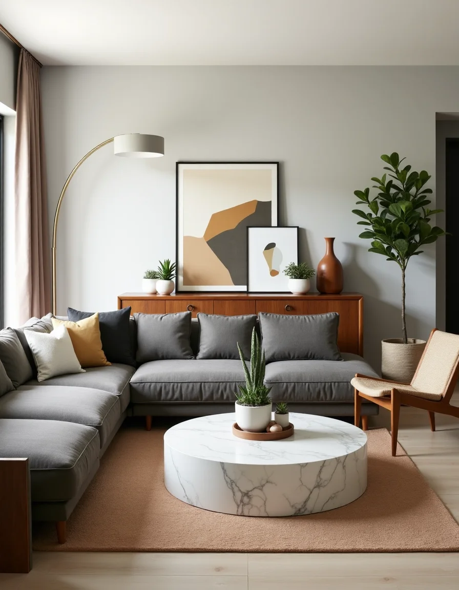 The living room exudes a sleek modern aesthetic with clean lines and a harmonious blend of materials. A large sectional sofa upholstered in muted gray fabric is placed centrally, complemented by a pair of minimalist accent chairs in warm wood tones on either side. A striking white marble coffee table sits atop a soft area rug in an earthy beige, creating a cozy focal point. Behind the sofa, an elegant console table fashioned from walnut showcases a selection of green succulents in simple white pots and various modern art pieces. The walls are painted a soft dove gray, while a geometric patterned throw blanket and abstract cushions in soft creams and earthy hues complete the inviting atmosphere.