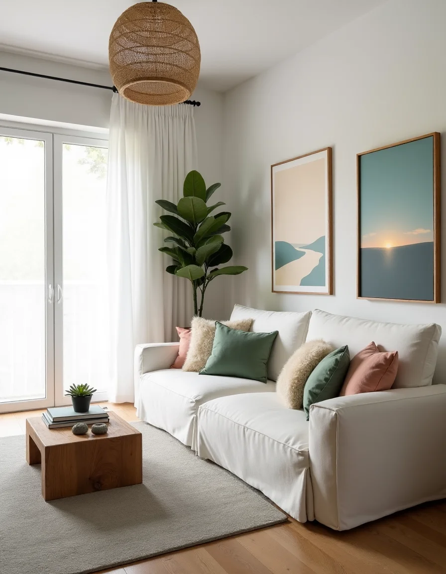 The living room is a serene sanctuary embodying Scandinavian design with a focus on natural materials and soft colors. Light oak flooring spans the area, complemented by a plush, muted gray area rug that anchors the space. A large, oversized white linen sofa sits centrally, adorned with an assortment of fluffy, pastel-colored throw pillows in sage green, blush pink, and soft beige. To one side, a minimalist wooden coffee table crafted from reclaimed wood serves as a focal point, adorned with a single potted succulent and a stack of Scandinavian literature. The walls are painted a soft white, featuring a gallery of minimalist framed prints and a large abstract painting in soothing blues and earthy tones. Floor-to-ceiling windows bathe the room in natural light, and sheer white curtains flutter gently in the breeze, creating an ambiance of calm and tranquility. A hanging pendant light made from natural wicker adds warmth and character, while a tall indoor plant in the corner contributes a refreshing touch of greenery.