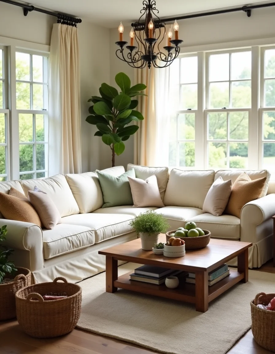 The living room is a serene haven showcasing country style with soft neutrals as its primary color scheme. An oversized, plush cream sectional sofa sits against the wall, adorned with pale sage and muted terracotta throw pillows for a pop of subtle color. A rustic wooden coffee table, made from reclaimed barn wood, centers the space, complemented by woven coasters made from natural fibers. Large windows draped in sheer white curtains allow ample natural light to flood the room, illuminating the gentle beige and taupe tones throughout. To complete the ambiance, potted greenery decorates the corners, woven baskets are scattered around for storage, and a vintage chandelier hangs from the ceiling, casting a warm glow during the evenings.