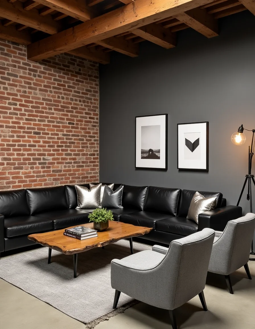 The living room showcases a stunning industrial style, characterized by exposed brick walls painted in a soft charcoal gray and an open ceiling revealing rustic wooden beams. A large, comfortable sectional sofa in deep black leather sits at the center, accented with metallic throw pillows that add a touch of shine. Flanking the sofa, two high-back chairs upholstered in textured gray fabric are positioned to create an inviting conversation area, while a raw-edged wooden coffee table takes center stage. On one wall, minimalist framed black-and-white photographs add artistic flair, and a vintage floor lamp with an Edison bulb overhead casts a warm glow during the evening, enhancing the room’s cozy yet modern ambiance.