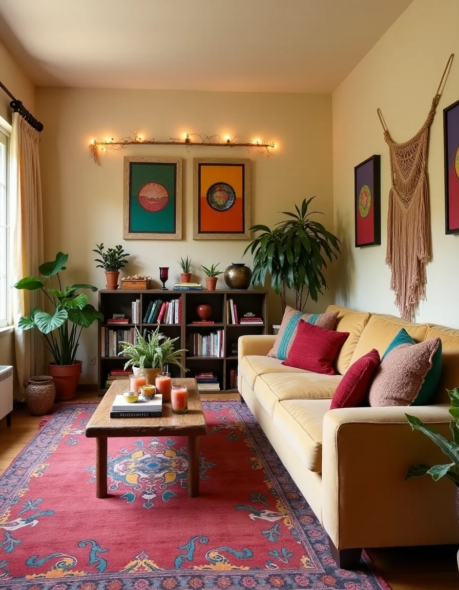 The living room exudes a vibrant bohemian atmosphere, with walls painted in a soft, creamy beige that provides a warm backdrop for eclectic art. A large, handwoven ornamental carpet in rich reds, earth tones, and splashes of teal anchors the space, creating a cozy focal point beneath an oversized, distressed light tan sofa adorned with multicolored throw pillows in varying textures and patterns. To the side, a reclaimed wooden coffee table is topped with assorted plants in terracotta pots and a collection of colorful candles, while framed abstract paintings in bold colors hang above a low bookshelf brimming with books and quirky decorative items. A large macramé wall hanging delicately drapes across one wall, and fairy lights in glass jars twinkle softly, lending an inviting and cheerful ambiance to the room.