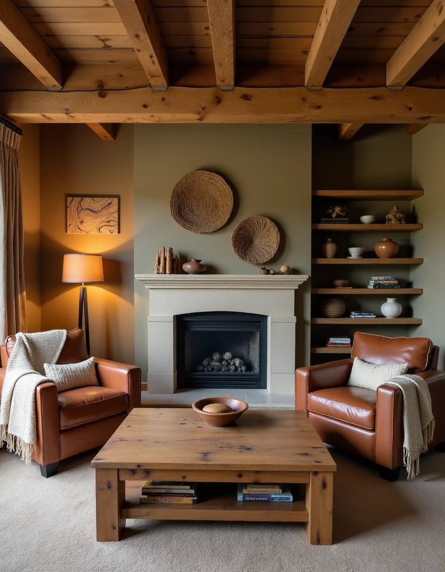 The living room features a cozy, rustic charm, exuding warmth and comfort. A large, reclaimed wood coffee table sits at the center, surrounded by a pair of oversized leather armchairs in a rich brown hue, both softened with knitted cream-colored throws. Exposed wooden beams traverse the ceiling, complementing the earthy taupe walls adorned with handcrafted pottery and nature-inspired wall art made from driftwood. In one corner, a vintage-style floor lamp with a burlap shade casts a warm glow over a plush area rug, while a wooden bookshelf filled with artisanal trinkets and books lies against another wall, inviting relaxation and conversation in this serene sanctuary.