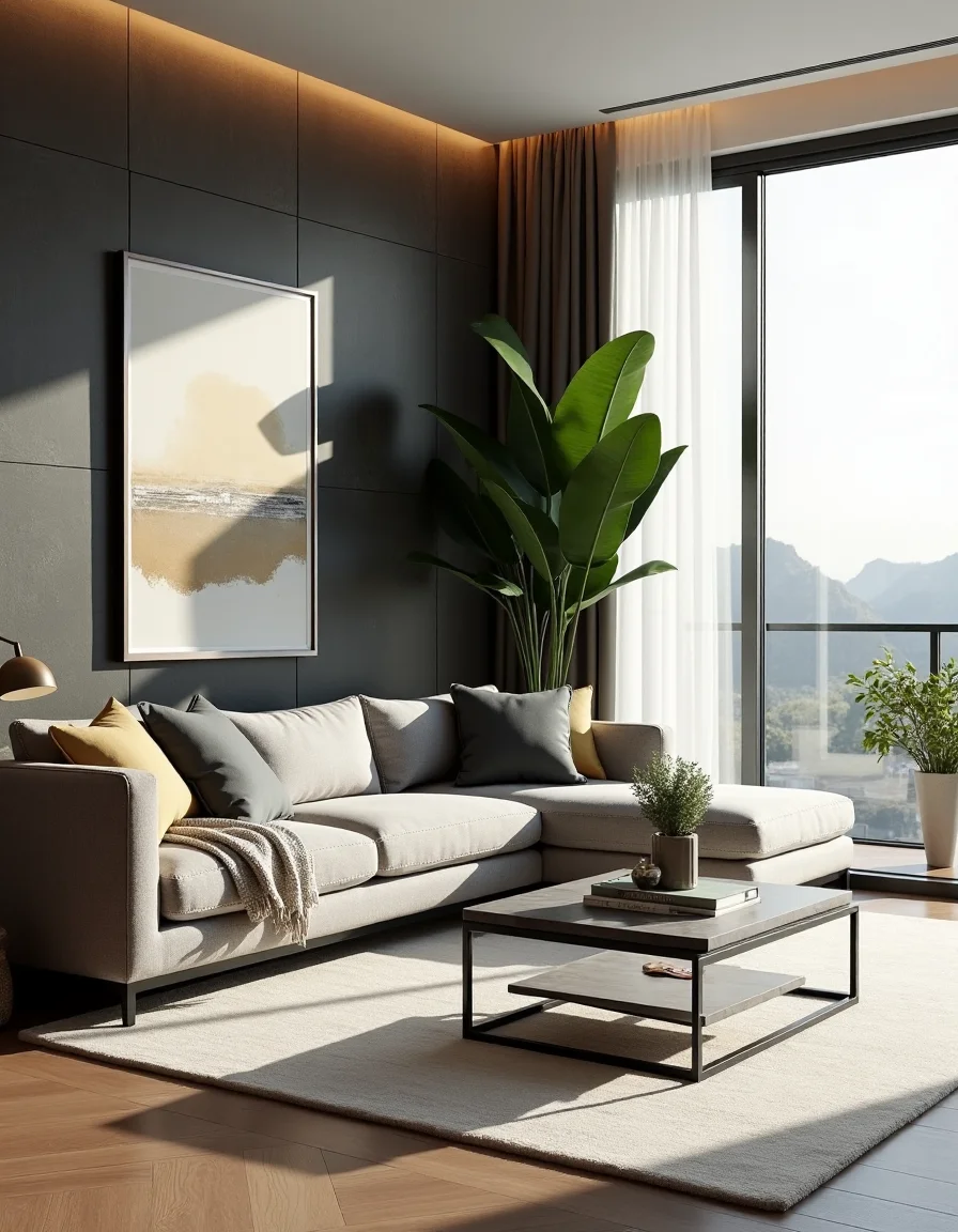 The living room exudes a modern elegance, showcasing high-quality materials that harmonize seamlessly with contemporary design. A plush grey sectional sofa upholstered in a soft, textured fabric anchors the space in the center, complemented by a striking marble coffee table with sleek black metal legs sitting atop a luxurious cream area rug. Behind the sofa, a feature wall of textured charcoal stone adds depth and sophistication, adorned with a minimalist abstract artwork that incorporates gold accents. Several stylish potted plants, such as a tall fiddle leaf fig and smaller succulents, bring a refreshing burst of greenery, while a modern floor lamp with a brushed brass finish stands elegantly in one corner, casting a warm glow during the evening hours. The large panoramic window not only floods the room with natural light but is framed by sheer white drapes that softly diffuse sunlight, enhancing the serene ambiance.