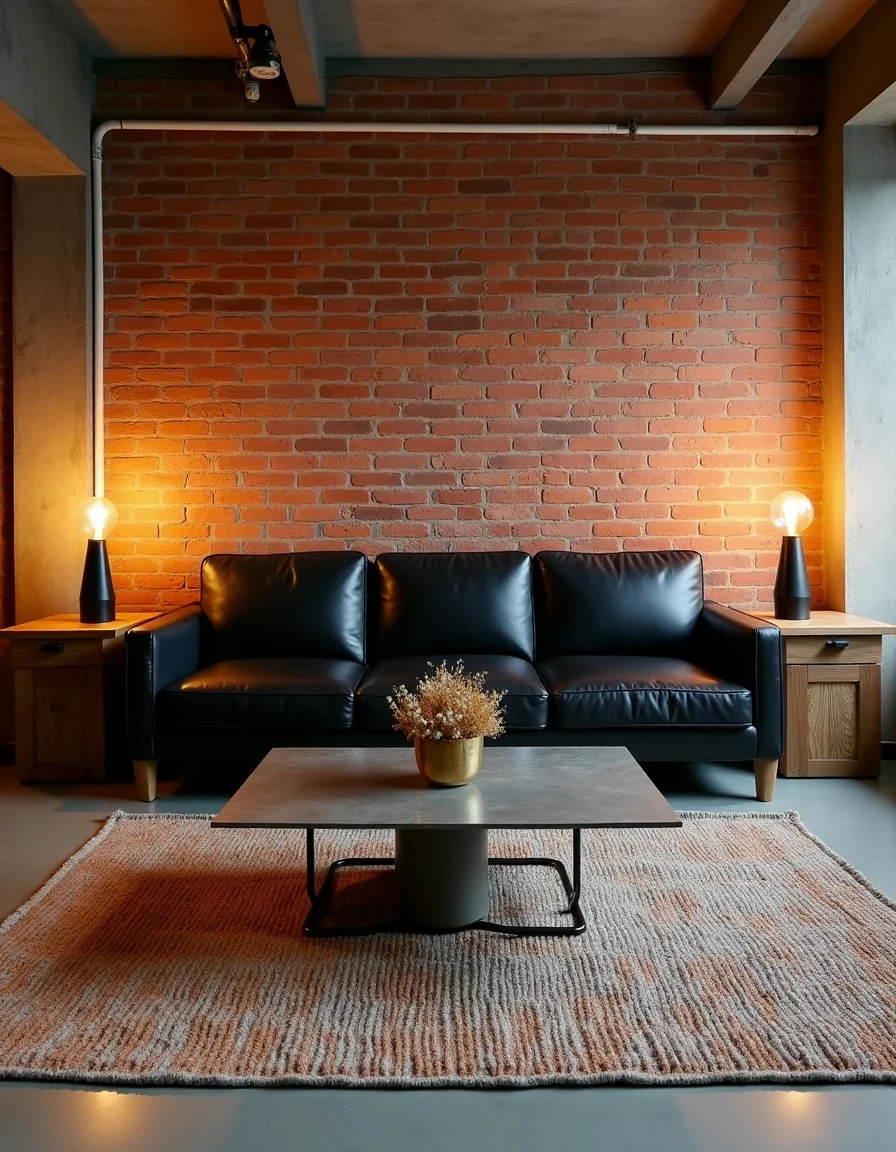 The industrial-style living room exudes a raw yet inviting ambiance, characterized by a large, plush black leather sofa centered against a backdrop of exposed red brick walls, which create a warm contrast to the coolness of surrounding concrete fixtures. Paired with the sofa are angular, reclaimed wood side tables that are topped with vintage Edison bulb lamps, casting a cozy golden glow throughout the space. A large, distressed metal coffee table sits invitingly in front, adorned with a simple vase of dried wildflowers, adding a touch of natural elegance. The flooring consists of polished concrete, accentuated by an oversized, handwoven area rug in shades of grey and burnt orange, grounding the room while offering warmth underfoot.
