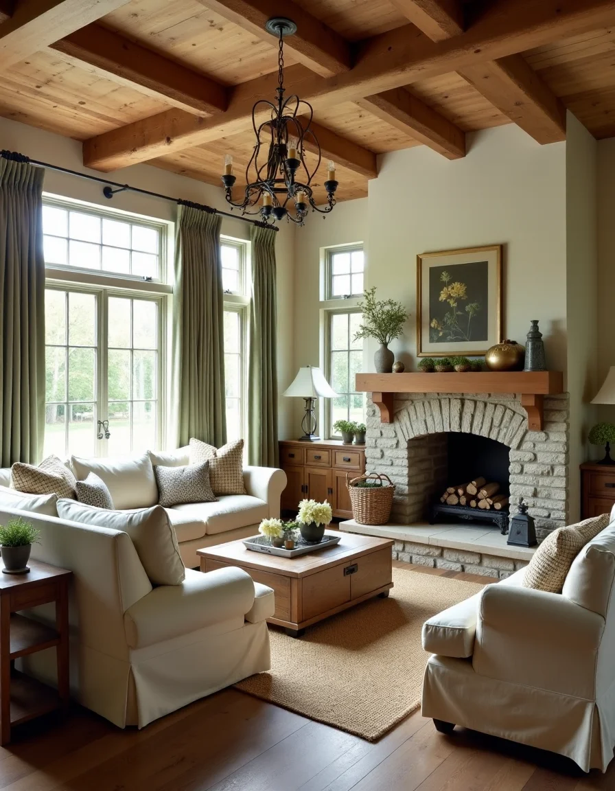 The living room features a warm, inviting country style, characterized by rich wood beams across the ceiling and aged wooden floorboards that give it an authentic rustic charm. A cozy L-shaped sectional sofa, draped with soft, beige slipcovers, is positioned facing a quaint stone fireplace, complete with a handmade mantle adorned with handpicked wildflowers. Natural light streams through large, grid-paned windows adorned with linen curtains in a muted sage green, casting soft shadows across a woven jute area rug that anchors the space. To add personal touches, an assortment of handcrafted wooden coffee tables and side cabinets showcase family heirlooms and potted succulents, infusing the room with a homely yet refined ambiance. Finished off with delicate decorative items like vintage lanterns and galvanized metal accents, this living room perfectly weaves together elements of comfort and elegance.