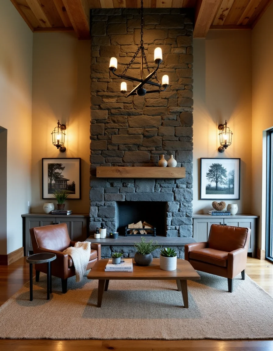 The living room exudes a rustic charm, featuring a stunning stone fireplace constructed from rough, dark granite that serves as the centerpiece of the space. Surrounding the fireplace are deep-set beige walls adorned with framed vintage black-and-white photographs, adding character to the room. A large, handwoven jute rug covers the hardwood floor, grounding the cozy seating area, which consists of a pair of distressed leather armchairs facing a reclaimed wood coffee table, laden with natural elements like small potted succulents and a chunky knit throw. The warm lighting emanates from metal lantern-style sconces mounted on the walls, and a large wrought-iron chandelier hangs from a wood-beamed ceiling, casting a soft glow throughout the room, enhancing the inviting ambiance that invites relaxation and conversation.