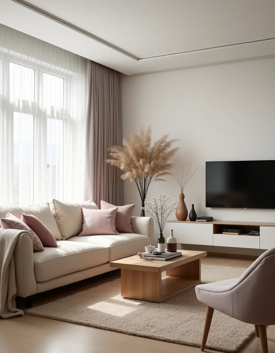 The living room embodies a serene Scandinavian aesthetic, featuring soft tones of warm white and pale gray for the walls, which create an airy and inviting atmosphere. A large, plush cream-colored sectional sofa is placed in the center, adorned with a mix of textured throw pillows in pastel pink and muted lavender, offering both comfort and style. A rustic wooden coffee table, with a light oak finish, rests atop a woven area rug in subtle beige hues, providing a tactile contrast to the smooth floorboards. Floor-to-ceiling windows invite natural light and are framed with sheer, flowing white curtains that gently dance in the breeze, while a sleek white media console houses discreetly organized electronics. Decorative elements like a minimalist faux fur throw draped over a cozy armchair, handcrafted ceramic vases displaying soft-hued dried flowers, and a plethora of indoor plants bring an element of nature inside, enhancing the room's tranquil vibe.