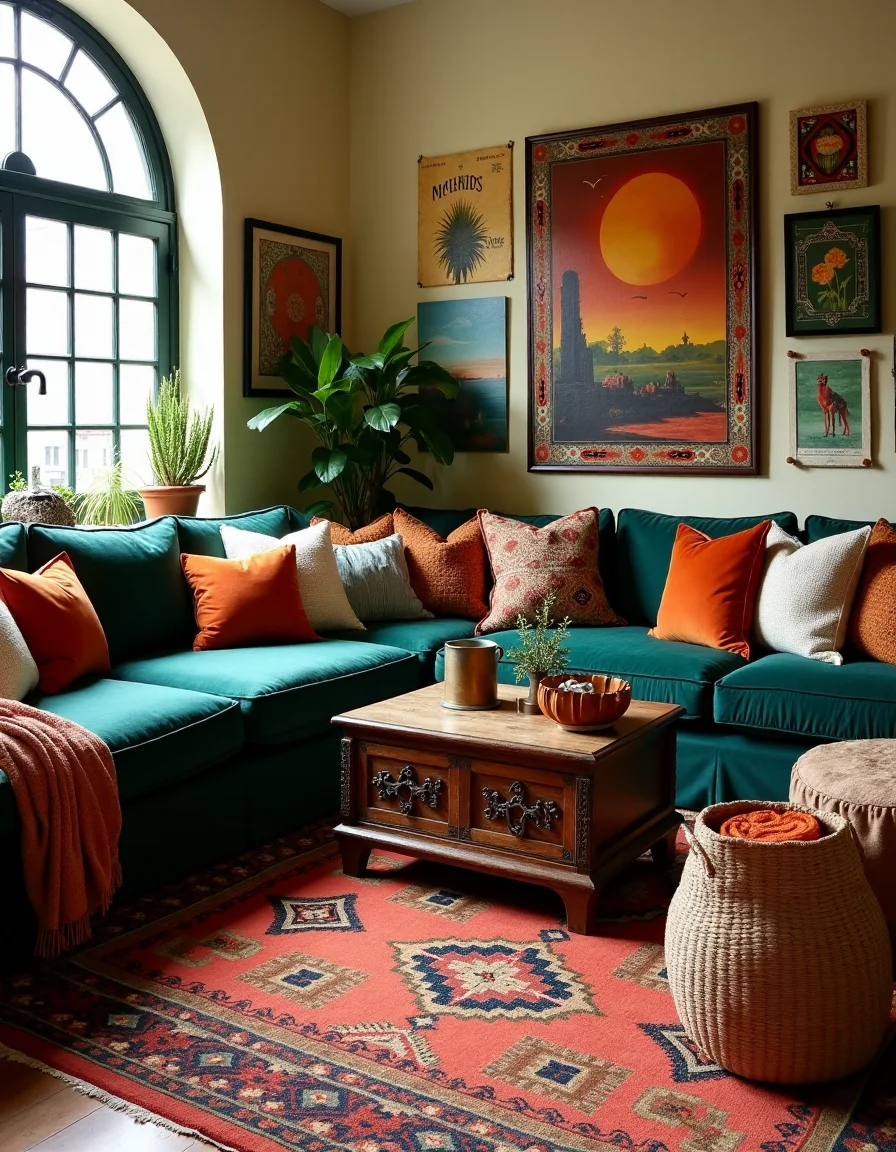 The living room exudes an inviting bohemian style, featuring a plush, oversized sectional sofa with rich jewel-toned upholstery in deep emerald and burnt orange, adorned with an array of mismatched throw pillows in various textures and patterns including paisleys and geometric designs. A vibrant, handwoven ornamental carpet anchors the space, its intricate designs bursting with warm hues of red, gold, and teal, complementing an antique wooden coffee table with ornate carvings sitting centrally on the rug. Surrounding the room are eclectic wall hangings: framed vintage travel posters, an assortment of colorful woven tapestries, and large canvas paintings depicting abstract landscapes, all contributing to a warm, artistic ambiance. Tall potted plants, like a fiddle leaf fig and snake plants, add a refreshing touch of greenery, while various decorative baskets hold cozy throws, enhancing both comfort and style.