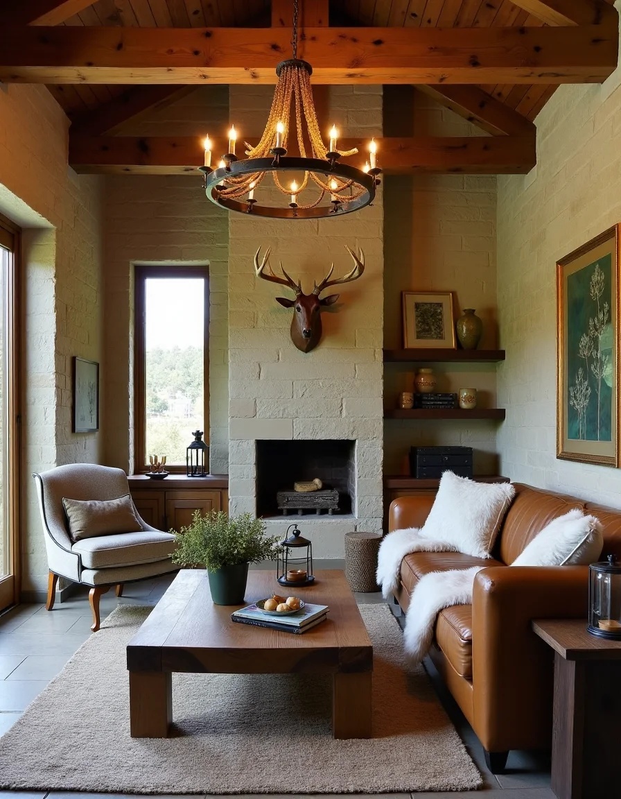 The living room embodies a cozy rustic charm, featuring exposed stone walls that serve as a stunning backdrop, giving a warm and earthy feel to the space. A large, weathered oak coffee table takes center stage, surrounded by a mix of mismatched upholstered chairs and a plush, deep-set leather sofa with faux fur throws draped over its arms. A handwoven wool area rug adds texture underfoot, while a mounted deer antler chandelier casts soft illumination overhead, complemented by vintage lanterns on side tables. Rustic wooden beams frame the ceiling, enhancing the room's rugged decor, while handmade pottery and botanical prints offer touches of artistry and nature throughout the space.