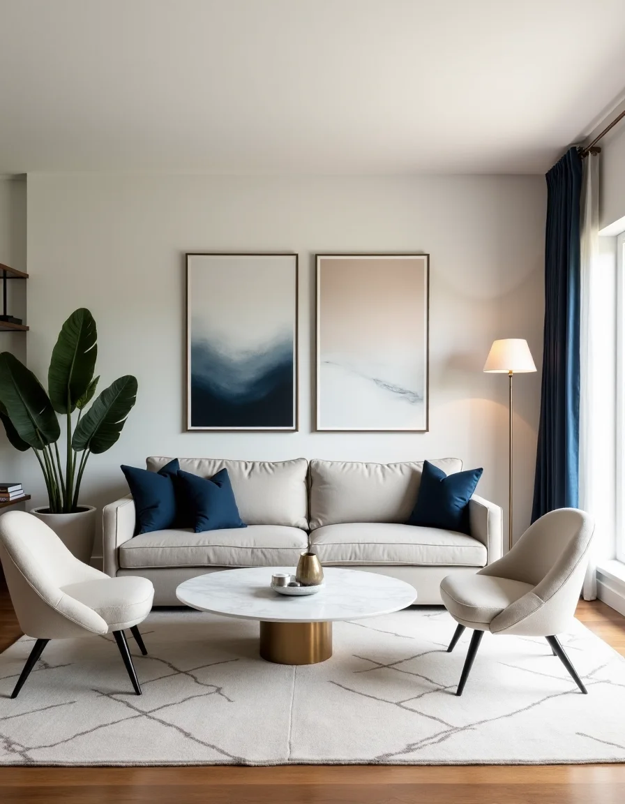 The living room exudes a sleek modern ambiance, featuring a soft palette of whites, grays, and subtle pastel accents that harmoniously complement one another. A plush, light gray sectional sofa sits centrally positioned, adorned with a few minimalist navy blue throw pillows for a touch of color. In front of it, a stunning oval coffee table crafted from white marble stands, flanked by two elegant mid-century modern chairs upholstered in smooth light beige fabric. The walls are adorned with large abstract art pieces in muted tones, and a contemporary silver floor lamp casts a warm, inviting glow over the space, while an oversized potted fiddle leaf fig in the corner adds a refreshing pop of green. Finishing touches include a soft area rug with geometric patterns that grounds the room, a sleek glass bookshelf showcasing curated decor pieces, and wooden accents that introduce texture and warmth to the otherwise crisp surroundings.