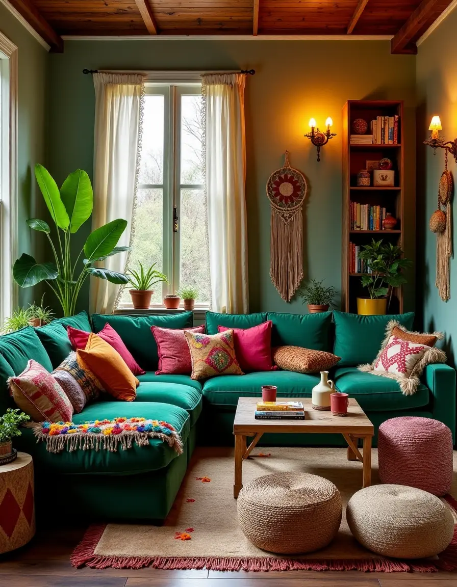 This vibrant bohemian living room is a sanctuary of comfort and creativity, filled with an eclectic mix of furniture and decor that tell a story of travel and artistry. The centerpiece is a large, deep green velvet sectional sofa adorned with an array of multicolored throw pillows featuring tribal patterns, fringe, and bold florals. A rustic wooden coffee table, distressed with bursts of teal paint, sits atop a soft, textured area rug in warm earth tones, surrounded by a set of mismatched poufs in varying sizes. Lush plants in woven baskets add life and freshness to the space, while macramé wall hangings and dreamcatchers drape beautifully around the room, enhancing the warm, inviting atmosphere with their intricate details. Sconces with colored glass shades cast a soft glow, illuminating a corner bookshelf filled with an assortment of quirky ornaments, travel books, and vintage finds.